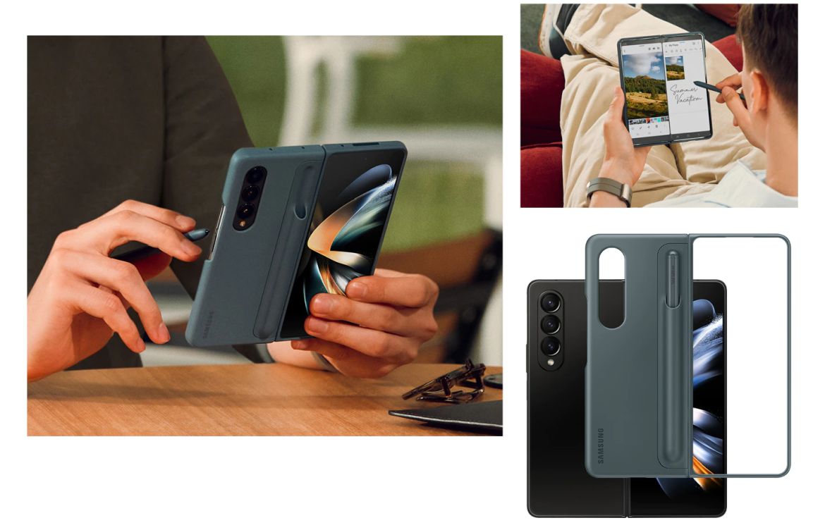Wszystko dla Twojej wygody. Standing Cover z rysikiem pozwala wygodnie pisać na ekranie Twojego Galaxy Z Fold4.*Zdjęcie ma charakter poglądowy.