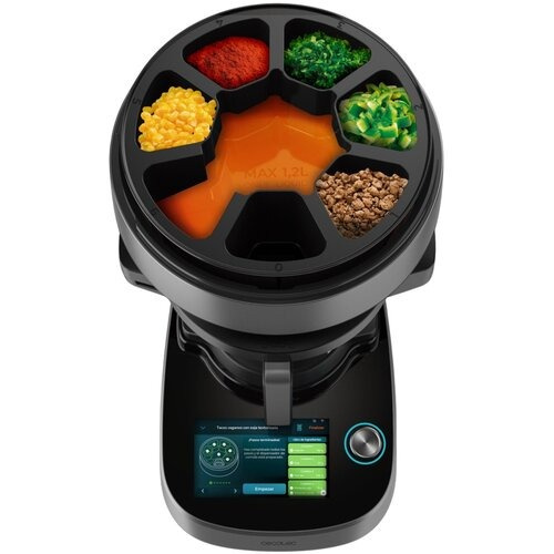 ⭐ Robot wyposażony jest w unikalny dozownik składników ChefCrown z przegródkami na 6 produktów oraz pojemnik na płyny. Umieść składniki wcześniej, a urządzenie samo doda je we właściwym momencie gotowania. Dzięki temu danie będzie zawsze perfekcyjnie przygotowane – nawet gdy nie masz czasu stać przy kuchence.