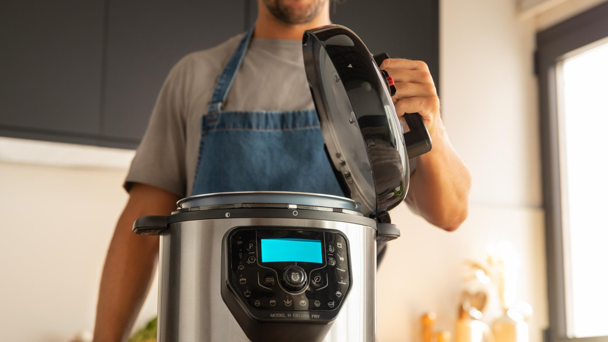 ⭐ Cecotec Olla GM H Deluxe Fry to prawdziwy kuchenny mistrz! Garnek elektryczny 6L z wbudowaną wagą i głowicą frytkownicy powietrznej zastąpi wiele urządzeń. Oferuje 27 programów gotowania, od duszenia po pieczenie, z możliwością programowania na 24h. Zdrowe potrawy, precyzyjne porcje i oszczędność energii – gotuj szybciej, lżej i smaczniej!